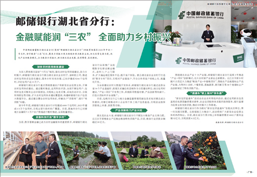 中国邮政储蓄银行湖北省分行(简称“邮储银行湖北省分行”)积极贯彻落实2021年中央一号文件,坚守服务“三农”定位,聚焦乡村振兴重点领域和重点服务主体,加大信贷支持力度,优化产品和服务模式,全力服务乡村振兴,助力湖北农业发展、农村繁荣、农民增收。
