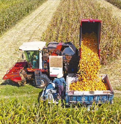 图为9月22日,蒙城县小辛集乡农民正在从收割机上卸下刚收获的玉米。