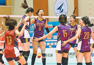 9月26日,天津队球员在比赛后庆祝胜利。当日,在第十四届全运会女排成年组决赛中,天津队3∶1战胜江苏队,夺得冠军。 |