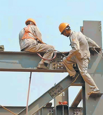 在中国援赞比亚玉米粉加工厂建设项目施工过程中,中国员工和当地员工正在安装钢梁。 |