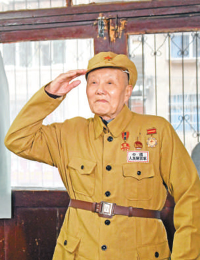 张富清穿着老式军装敬军礼(资料照片)。 |
