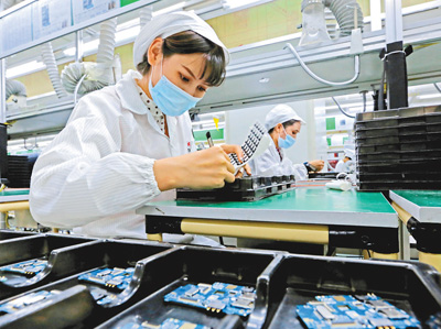 9月23日,位于新疆乌鲁木齐经济技术开发区(头屯河区)的一家电子科技公司内,员工正在手机生产车间赶制出口订单,该公司生产的手机、笔记本电脑、智能穿戴产品等销往中亚、南亚市场。