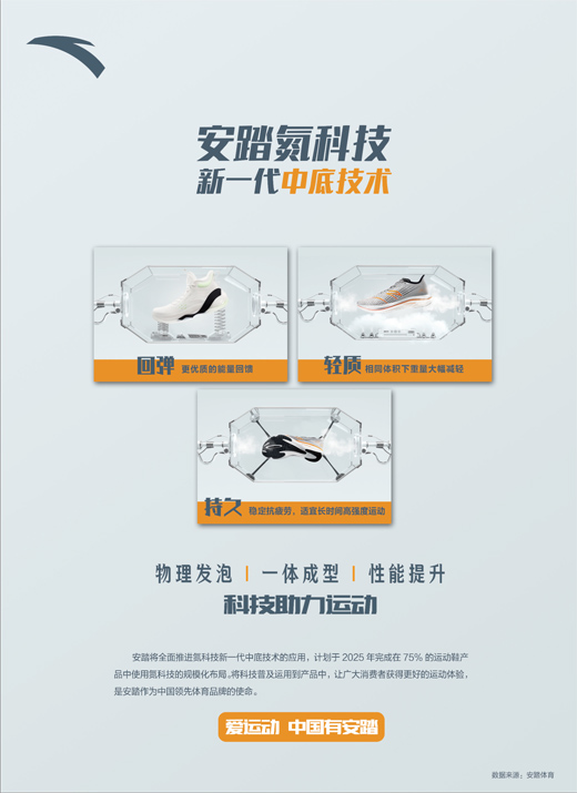 安踏将全面推进氮科技新一代中底技术的应用,计划于2025年完成在75%的运动鞋产品中使用氮科技的规模化布局。将科技普及运用到产品中,让广大消费者获得更好的运动体验,是安踏作为中国领先体育品牌的使命。