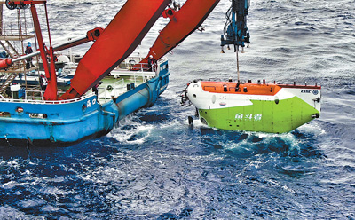 图为“探索一号”科考船正在回收“奋斗者”号。
