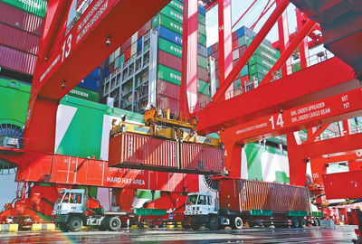图为10月6日,科伦坡国际集装箱码头正在进行超大型集装箱船舶装卸作业。