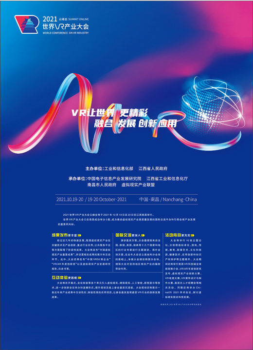 2021世界VR产业大会云峰会将于2021年10月19日至20日在江西南昌举行。
