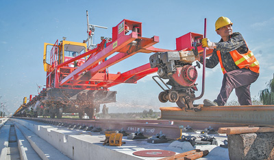 近日,由中铁四局八公司京唐项目部运输队负责的京唐城际铁路铺轨正加紧施工。图为施工队员在切割轨道。