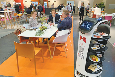 在科隆食品展上,中国企业研发的送餐机器人吸引了观众的目光。 |