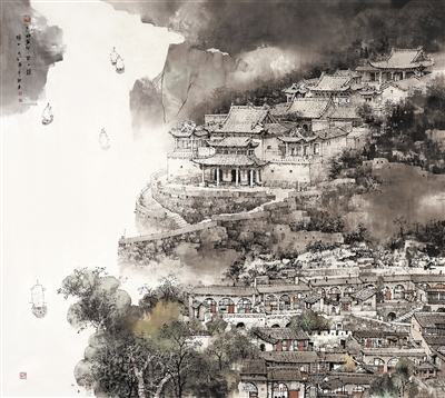 刘建中国画《九曲黄河第一镇·碛口》。 |