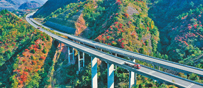 10月23日,地处豫西山区的河南省三门峡市卢氏县境内,青松翠柏与红叶交相辉映,一辆辆货车穿行在风景如画的峡谷长廊之间。