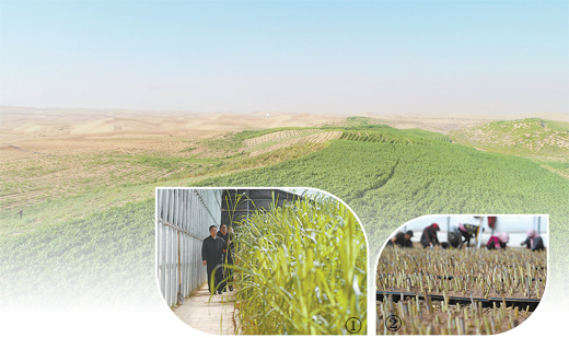 题图为内蒙古自治区阿拉善盟乌兰布和沙漠菌草防风治沙基地。 |