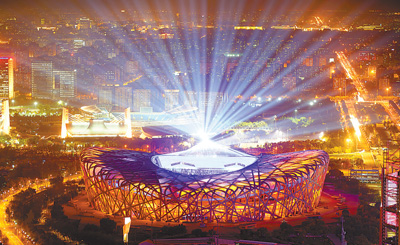 10月28日,北京冬奥会、冬残奥会标志性场馆群国家体育场、国家速滑馆、国家游泳中心首次集体亮灯。当天,承担着冬奥会、冬残奥会开闭幕式任务的国家体育场“鸟巢”改造工程完工。图为璀璨夺目的国家体育场“鸟巢”。