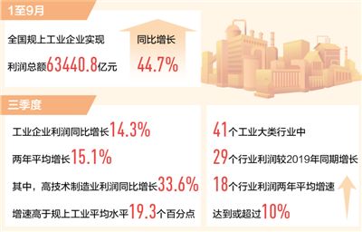 本报北京10月29日电 (记者陆娅楠)国家统计局日前公布数据显示,1—9月,全国规模以上工业企业实现利润总额63440.8亿元,同比增长44.7%,两年平均增长18.8%(以2019年同期数为基数,采用几何平均方法计算)。三季度,工业企业利润同比增长14.3%,继续保持两位数增长;两年平均增长15.1%,总体保持良好增势。其中,9月份利润同比增长16.3%,增速较上月加快6.2个百分点。