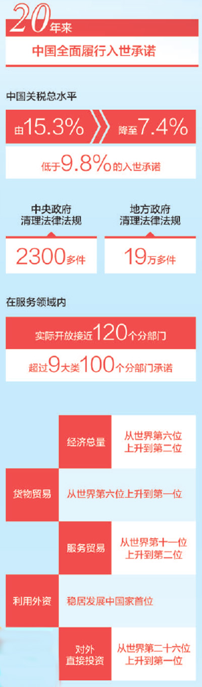 持续推进贸易便利化,关税总水平由加入世贸组织前的15.3%降至如今的7.4%,大规模开展法律法规清理修订工作……加入世贸组织20年来,中国全面履行入世承诺,坚定不移扩大开放,更多商品和服务进入中国市场。