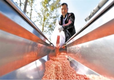 10月13日,山东聊城茌平区肖家庄镇田庄村农民往播种机里添加小麦种子。 |