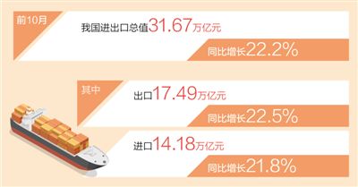 本报北京11月9日电 (记者欧阳洁)记者近日从海关总署获悉:今年前10个月,我国进出口总值31.67万亿元,同比增长22.2%,比2019年同期增长23.4%。其中,出口17.49万亿元,同比增长22.5%,比2019年同期增长25%;进口14.18万亿元,同比增长21.8%,比2019年同期增长21.4%。10月份,我国进出口总值3.34万亿元,同比增长17.8%,比2019年同期增长23%。