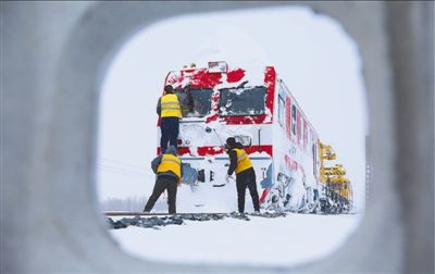 11月9日,内蒙古赤峰,铁路职工清理列车上的积雪和冰块。受持续强冷空气影响,内蒙古大部分地区出现大风降雪天气。为保障运输畅通,铁路部门组织人员抢险清雪。