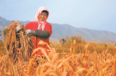 甘肃省张掖市甘州区花寨乡花寨村,村民收获金穗饱满的谷子。 |