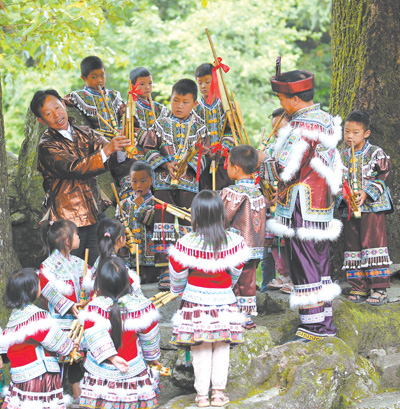 在位于桂黔交界的乌英苗寨,教师蒙林安(左)在教学生吹奏芦笙。 |