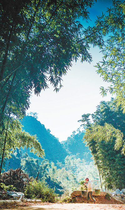 广西壮族自治区靖西市龙邦镇上坝村古赖屯,村民挑水走过。 |