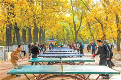 辽宁省鞍山市打造15分钟健身圈,开展丰富多彩的全民健身活动。图为市民在公园打乒乓球。 |