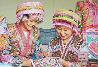 近年来,贵州省黔西市积极培育非遗文化产业,设立非遗手工刺绣作坊,承接旅游商品订单,通过刺绣、蜡染等工艺助力乡村振兴,促进农民增收。图为日前,黔西市红林彝族苗族乡渔塘社区苗族妇女在刺绣作坊里刺绣。