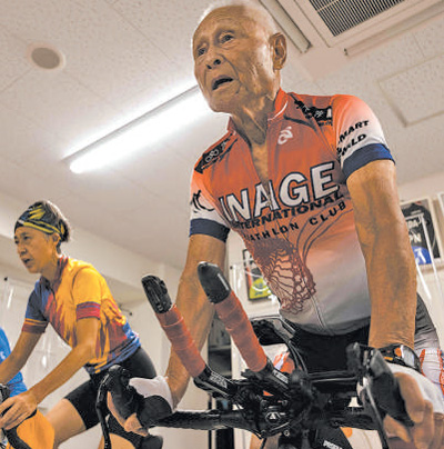 日本千叶县,老年选手正在为铁人三项比赛做准备。 |