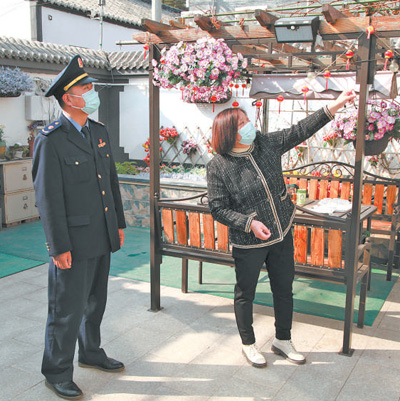 “晋大姐!”王海涛走进福地集贤民宿,热络地和个体工商户晋清华打招呼,“我们来例行检查,让小马测一下食用油和餐具。”