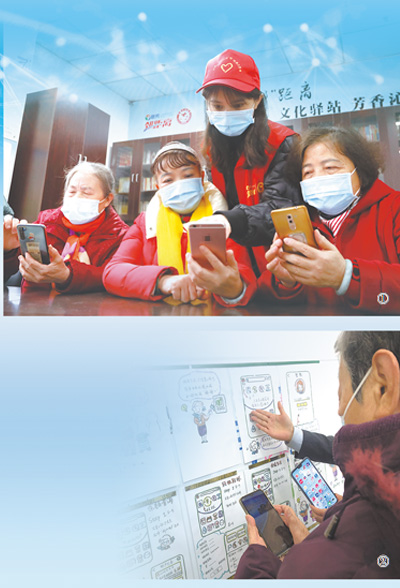 图①:重庆市沙坪坝区联芳街道平顶山社区,社区志愿者教老年人使用智能手机。 |