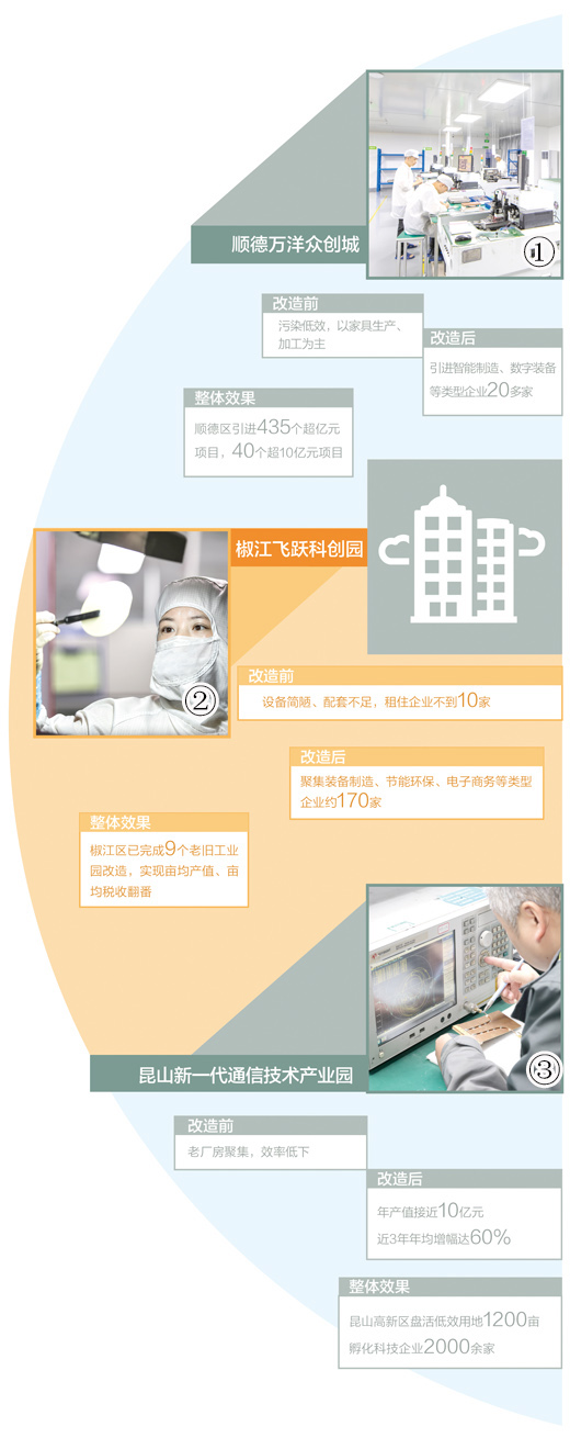 飞跃科创园工业用地腾笼换鸟的做法,是椒江区推进转型升级的一个缩影。据统计,全区已完成9个老旧工业园改造,实现平均容积率、亩均产值、亩均税收翻番。