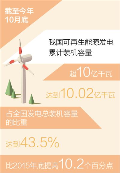 本报北京11月28日电 (记者丁怡婷)今年以来,我国可再生能源装机规模稳步扩大,结出累累硕果。国家能源局近日发布的数据显示:截至今年10月底,我国可再生能源发电累计装机容量超10亿千瓦,达到10.02亿千瓦,相当于40多个三峡电站的装机容量,比2015年底实现翻番,占全国发电总装机容量的比重达到43.5%,比2015年底提高10.2个百分点。其中,水电、风电、太阳能发电和生物质发电装机容量分别达到3.85亿千瓦、2.99亿千瓦、2.82亿千瓦和3534万千瓦,均稳居世界第一。