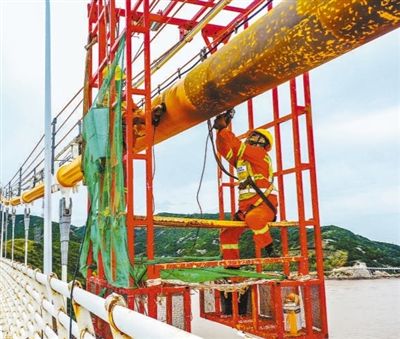 从今年8月底开始,岱山县官山大桥缆吊系统开始维修,首次应用氧化聚合型包覆防腐技术,如今大桥缆吊系统已换上“新装”。官山大桥是悬索跨海特大桥,主跨580米,桥梁长926米,采用双向4车道一级公路标准建设。
