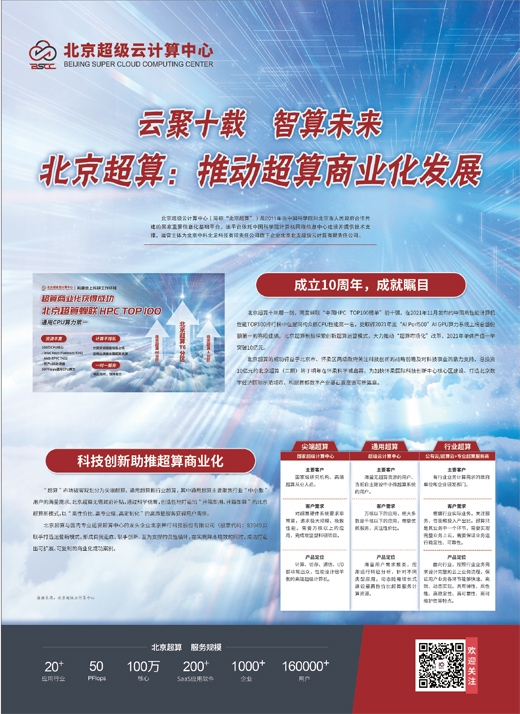 北京超算十年磨一剑,两度蝉联“中国HPC TOP100榜单”前十强,在2021年11月发布的中国高性能计算机性能TOP100排行榜中位居同构众核CPU性能第一名,更取得2021年度“AI Perf500”AI GPU算力系统上榜总量份额第一的亮眼佳绩。北京超算积极探索创新超算运营模式,大力推动“超算市场化”改革,2021年单体产值一举突破10亿元。