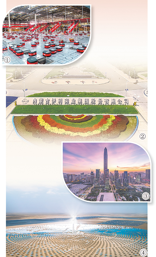 图①:京东物流分拣AGV机器人正在工作。 图②:伊利集团总部。 图③:位于深圳的平安金融中心。 图④:中国绿发打造的青海海西蒙古族藏族自治州多能互补集成优化示范工程。 资料图片 本版摄影:伊 霄 张武军