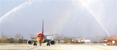 花果山机场由东部机场集团和连云港市共同出资建设,为4D级民用运输机场,总投资37.29亿元,是国家和江苏省“十三五”期间重点规划建设项目。图为首航班机通过花果山机场水门。