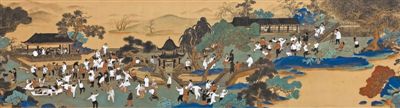 纵览中国古代绘画史,不乏表现骑射、马球、冰嬉等体育题材的美术作品。如今,一些美术工作者尝试从这些作品中汲取营养,以传统中国画的形式意趣表现当代生活图景,较具代表性的作品有罗小颜、陈煜璧合作的中国画《晨练》。作品采用传统青绿山水的设色与构图,点景人物穿行其中,宁静典雅,意趣生动。画面以长卷形式展开,湖天平远,楼阁小桥、一两扁舟皆对应现实公园的景色。细看画中人物,或静坐垂钓,或欢快起舞,或拂袖挥剑,日常生活中的晨练时刻得到巧妙再现,令人印象深刻。这也启示着当代美术工作者,传统中国画的创作内容同样来源于生活,今日中国画的创新,既要立足传统,更要深入生活,从题材内容、形式语言、创作理念等方面寻求突破。
