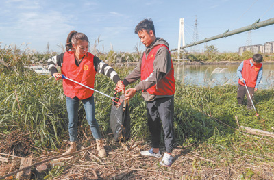 11月15日,浙江省湖州市德清县乾元镇东苕溪沿岸,志愿者在清理垃圾。 |