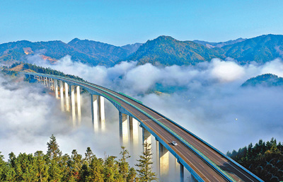 12月6日,贵州省黔东南苗族侗族自治州剑榕高速乌公特大桥周边云雾缭绕,景色如画。乡村路连上了高速路,农村交通条件改善,致富路越走越宽。