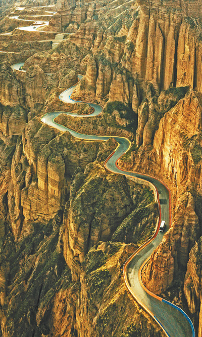 甘肃省中部山区,大巴车行驶在蜿蜒的盘山路上。 |