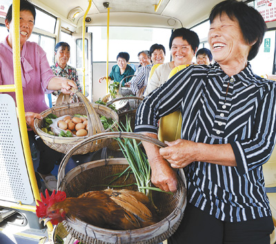 江苏省宿迁市泗洪县孙园镇李庙村村民赶集归来,在公交车上交谈。泗洪县加强县乡村路网建设,配置农村公交,让农民在家门口就能坐上公交车赶集市、进县城。 |