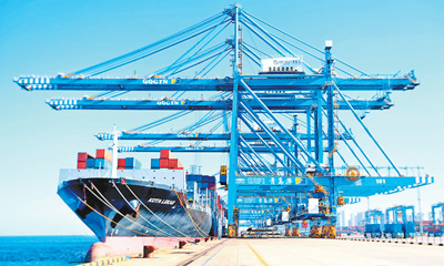 12月7日,山东港口集团青岛港全自动化码头,货轮在装卸外贸集装箱。