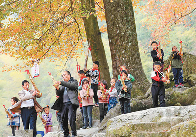 12月14日,在桂黔交界处的乌英苗寨教学点“芦笙文化进校园”课堂上,师生们在校门口的老枫树下学习吹芦笙。近年来,广西壮族自治区柳州市将苗族芦笙、侗族大歌等非遗文化引进中小学课堂,以更好地传承优秀传统文化。