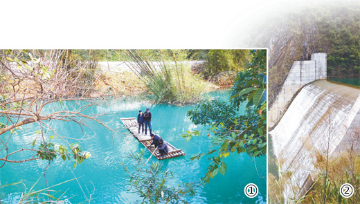 图①:近日,在蒙江坝王河保护区,督察人员划竹排检查水下是否存在捕鱼装置。 |