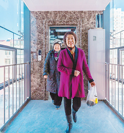 居民从内蒙古自治区呼和浩特市玉泉区农科院小区一栋老旧居民楼加装的电梯内走出。 |