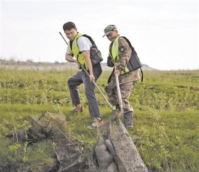 退捕上岸后成为环保志愿者的渔民在湖南岳阳东洞庭湖湿地中清理退捕遗留的渔网。 |