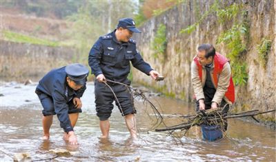 贵州黔西雨朵镇派出所民警和志愿护渔队队员清理长江流域雨朵河河道杂物。 |