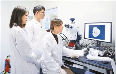 傅斌清(右一)与学生在生命科学实验中心通过体视显微镜观察小鼠胚胎发育。 |