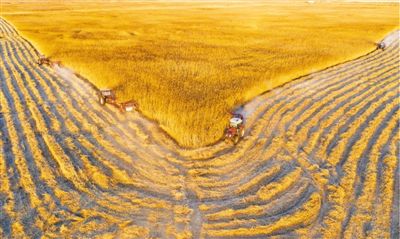 一台台收割机驰骋在茫茫苇海,实现收割、打捆、装车、运输全程机械化。芦苇收割全程机械化,既大大提高了工作效率,还解决了传统收割留寸茬的问题,可保护苇芽越冬,促进湿地可持续发展。