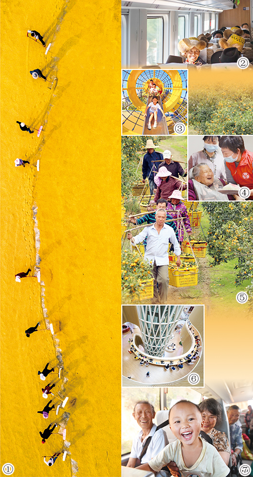图①:在江苏省宿迁市泗洪县石集乡一处晒场,农户抢抓晴好天气摊晒水稻。 陈 玉摄(影像中国) 图②:西藏自治区首条电气化铁路拉林铁路建成通车,复兴号列车实现31个省区市全覆盖。图为乘坐复兴号的乘客。 新华社记者 普布扎西摄 图③:小朋友在浙江省玉环市大麦屿街道的口袋公园内玩耍。 段俊利摄(影像中国) 图④:安徽省六安经济技术开发区妇联联合辖区内爱心企业看望高龄老人。 田凯平摄(人民视觉) 图⑤:广西壮族自治区柳州市融安县大将镇才妙村橘园里,果农挑送金橘。 韦荣军摄(影像中国) 图⑥:读者在湖北省襄阳市图书馆里阅读。 杨 东摄(影像中国) 图⑦:江西省丰城市实现村村通公交,便捷山乡百姓出行最后一公里。图为荷湖乡高峰村村民乘坐公交车出行。 周 亮摄(影像中国) |