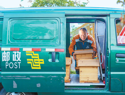 在浙江省湖州市长兴县,林城镇邮政所蜂产业专职投递员王国庆把要寄递的蜂箱搬上快递车。 |